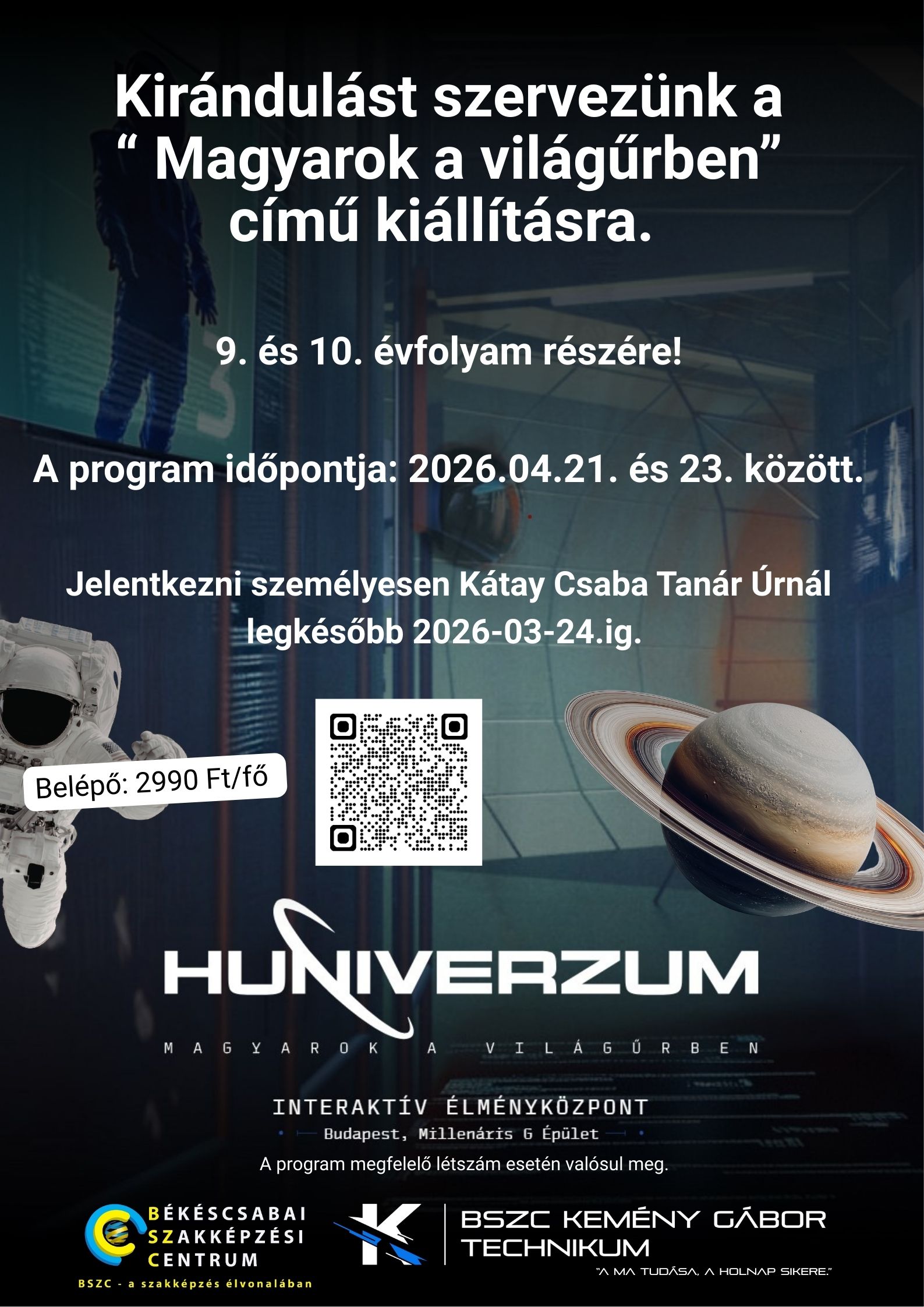 A fenntarthatósági témahét keretében 2026. április 21. és 23. között kirándulást szervezünk Budapestre a Huniverzum, Magyarok a világűrben című kiállításra. A jelentkezők létszámának függvényében valósul meg a kirándulás, és ezek után lesz meg a pontos dátum.